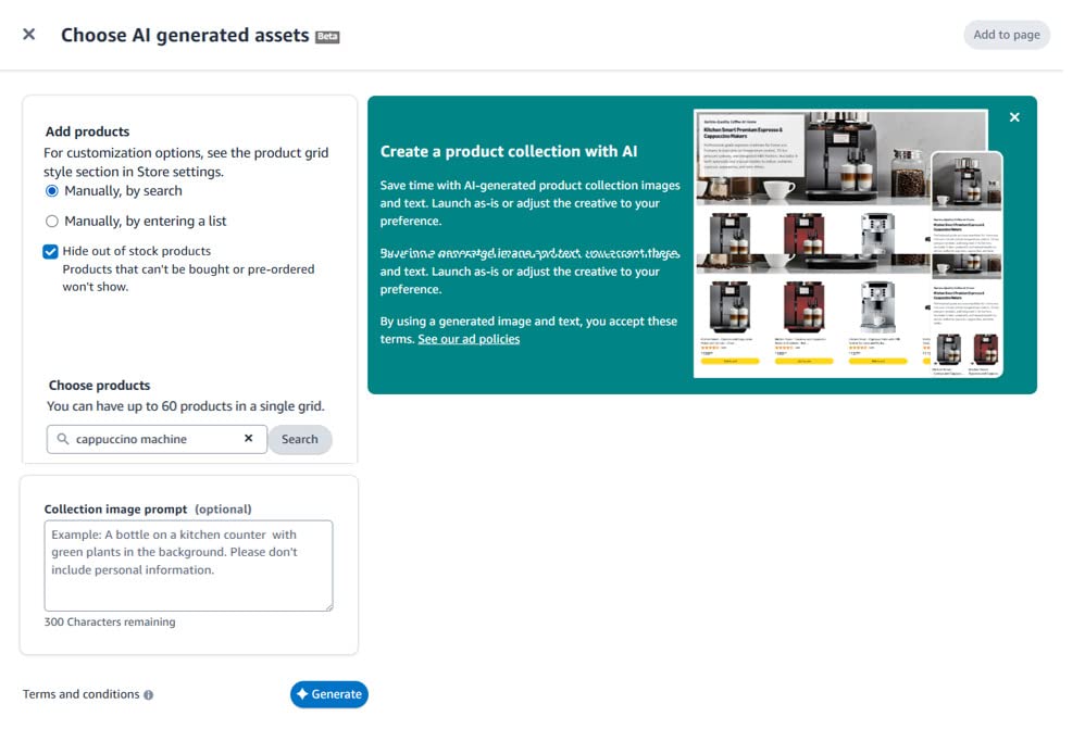 Add a Page With AI (Beta) enables brands to stand up Store pages quickly with minimal assets or experience. It also reduces the workload for brands with limited creative or copy resources.
